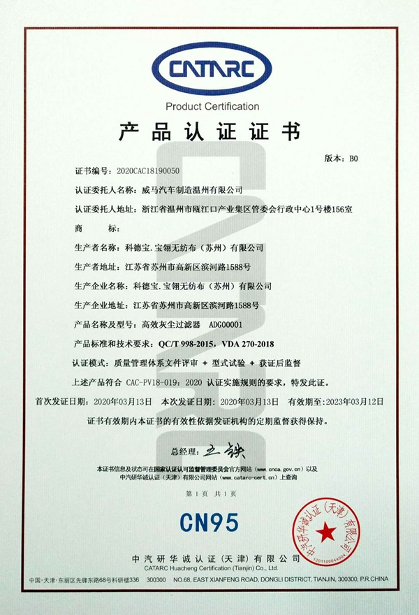 威马汽车获得中汽研CATARC最新发布的CN95等级标准认证