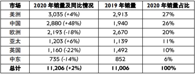 2020年,美洲地区为宾利汽车全球第一大市场;中国市场凭借高达48%的 销量增长紧随其后。
