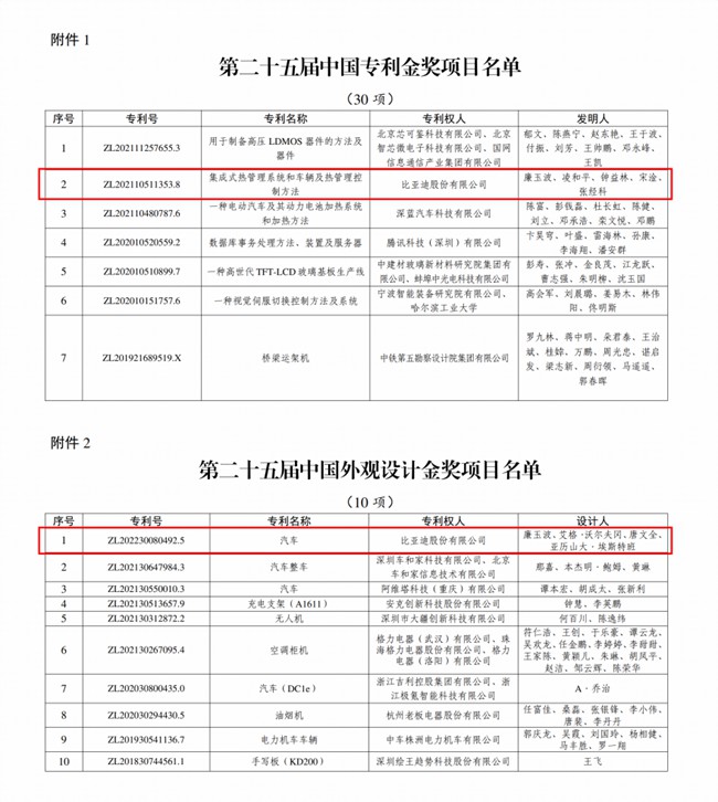 近日,国家知识产权局正式发布《关于第二十五届中国专利奖授奖的决定》,比亚迪凭借领先的技术创新和卓越的设计能力,成功摘得两项重量级专利大奖。其中,集成式热管理系统专利荣获第二十五届中国专利金奖,腾势D9外观专利荣获第二十五届中国外观设计金奖。