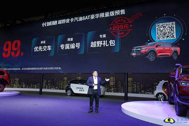 11月22日,2019广州国际车展开幕。长城炮越野皮卡汽油8AT豪华限量版正式预售,本次预售限量99台,通过唯一通道长城汽车京东官方旗舰店支付999元抢订成功的用户,均可拥有属于自己的专属车辆编号,并附赠专属越野大礼包。发布会现场,长城炮越野皮卡豪华限量版001号车授于越野e族高级总监蒋波先生。