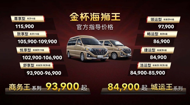 11月29日,华晨雷诺金杯合资后首款LCV——金杯海狮王北区上市发布会在北京举行。新产品分为城运王和商务王两大系列,其中城运王系列售价为84,900元-97,900元,商务王系列售价为:93,900元-115,900元。
