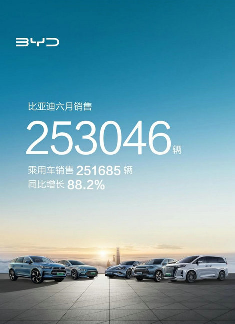 比亚迪汽车6月销售253046辆,同比增长88.2%。今年上半年,比亚迪汽车累计销量已达125.56万辆,其中海外累计销量7.43万辆,上半年累计销量同比增长95.8%,再次刷新中国新能源汽车月销记录,以绝对优势稳坐全球新能源汽车销冠,带动新能源汽车产业加速向前。