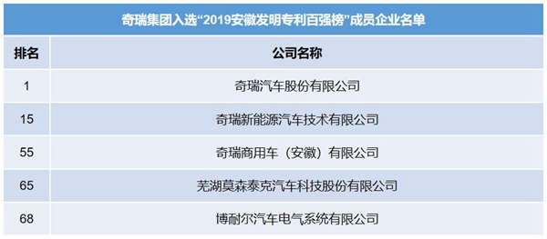 近日,安徽省市场监督管理局(安徽省知识产权局)、安徽省经济和信息化厅、安徽省教育厅联合发布“2019安徽省发明专利百强榜”。奇瑞控股集团(以下简称“奇瑞集团”)共有5家成员企业入榜,它们分别是奇瑞汽车股份有限公司、奇瑞新能源汽车技术有限公司、奇瑞商用车(安徽)有限公司、芜湖莫森泰克汽车科技股份有限公司、博耐尔汽车电气系统有限公司。其中,奇瑞汽车股份有限公司排名第一,连续6年位居榜首。